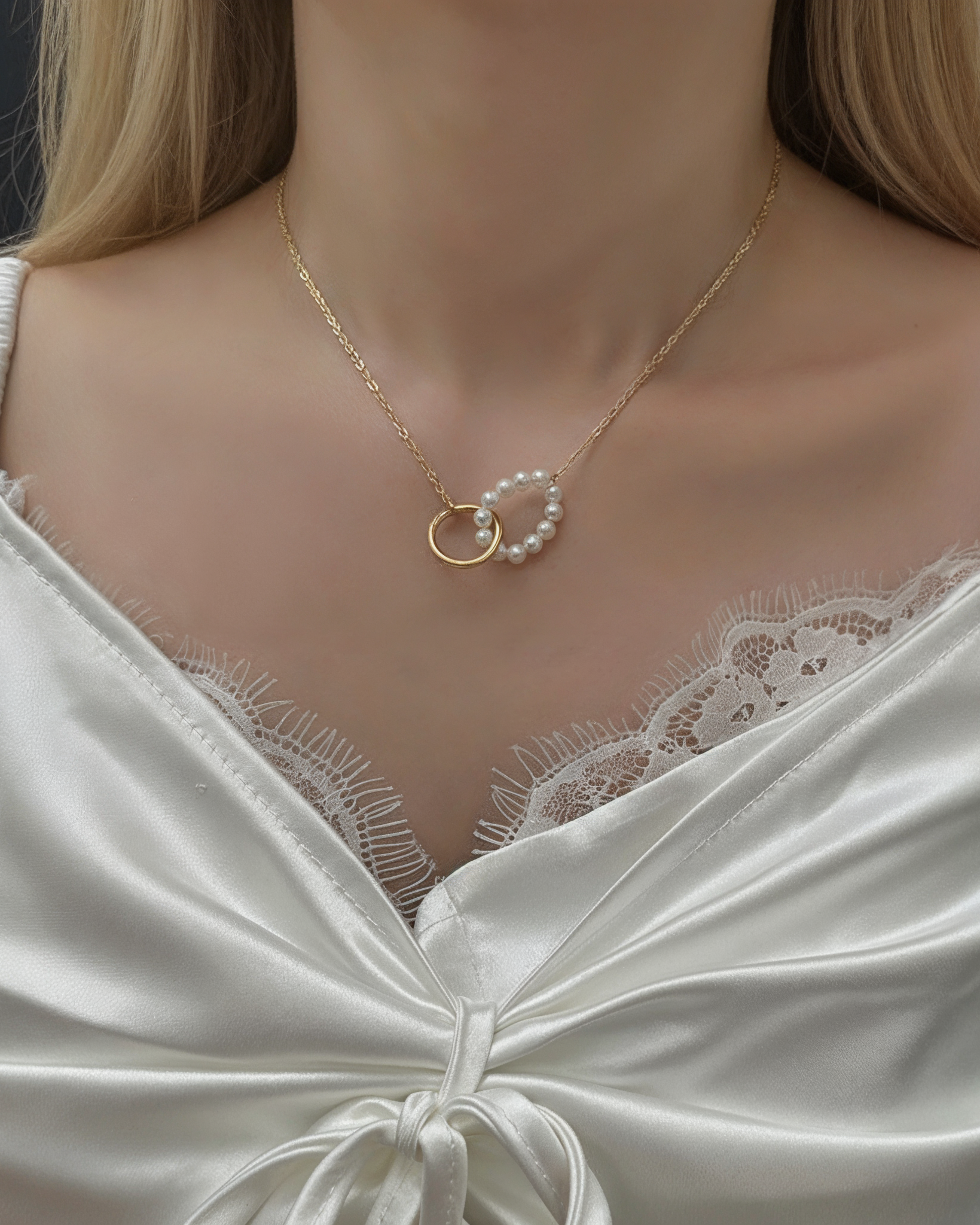 Lia necklace captures timeless sophistication through contrast and harmony. The golden ring intertwined with luminous pearls evokes connection, purity, and enduring beauty, creating a delicate yet powerful statement of elegance.