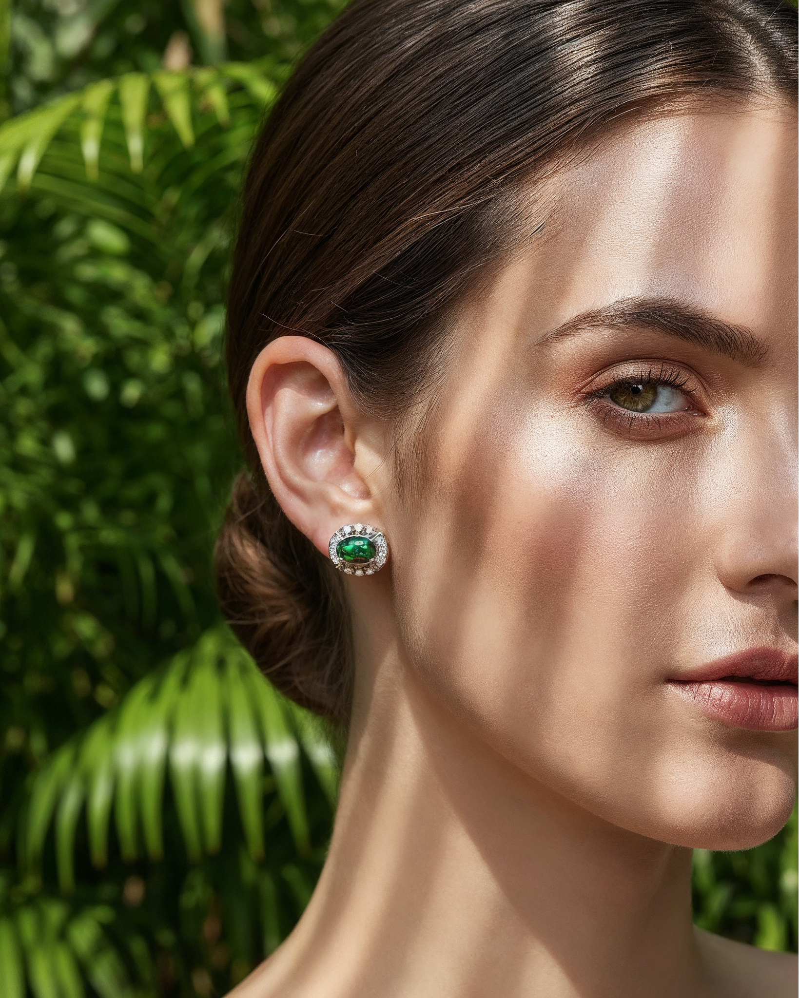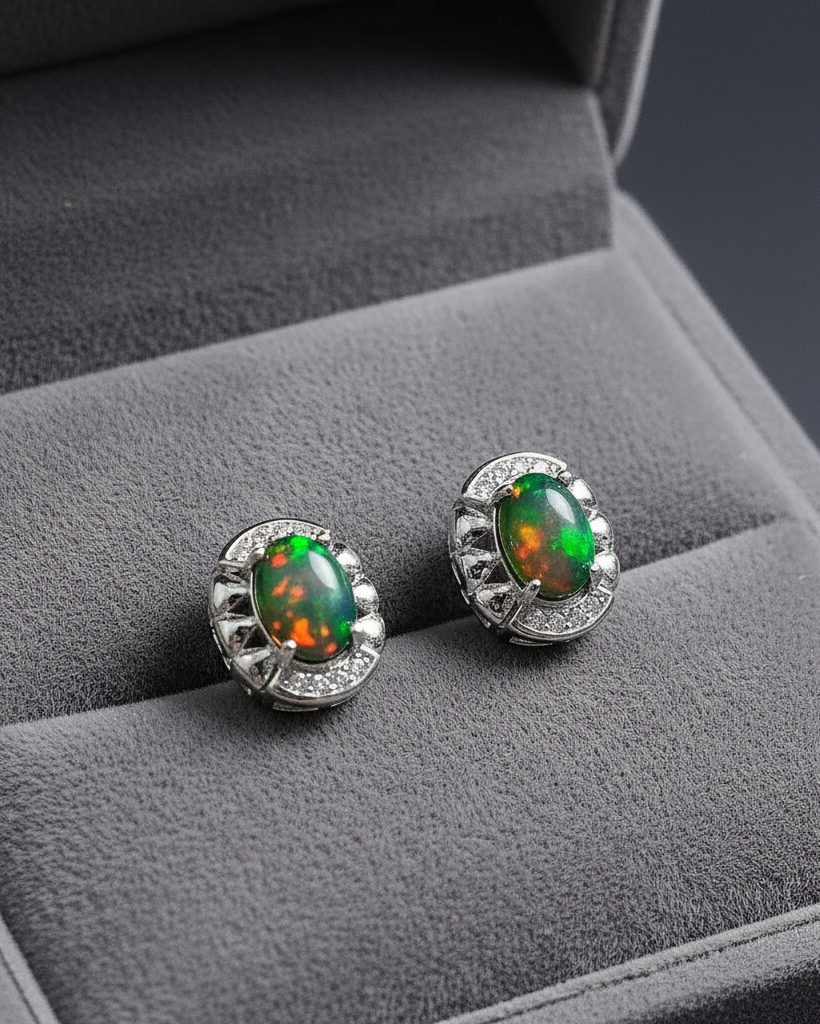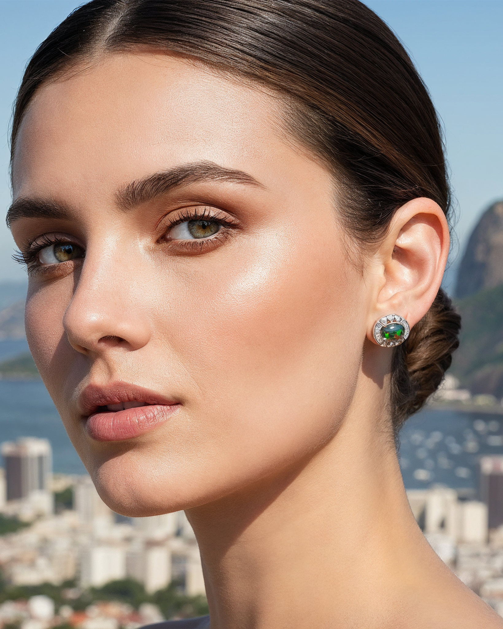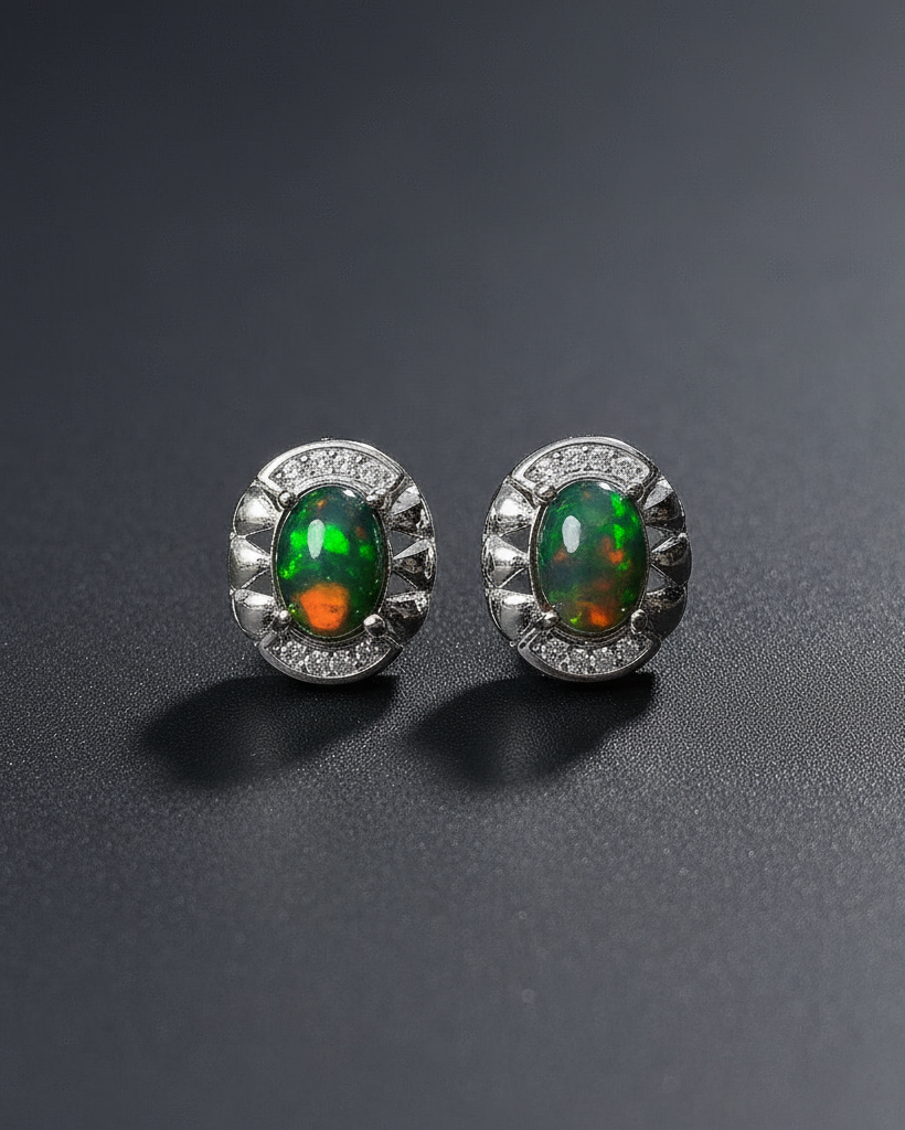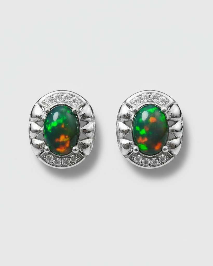 Elegant and enigmatic, Green Horizon is a stud earring featuring an iridescent green center stone, framed by a silver-toned, faceted setting and delicate zirconia accents. Sophistication in a subtle form.