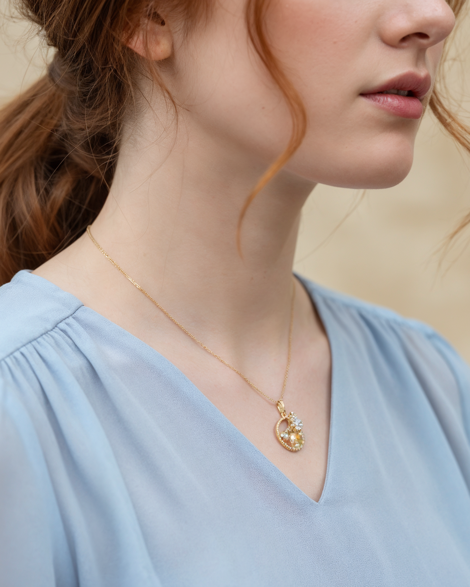 Fioréa necklace captures the poetry of nature in gold. Delicate flowers and a butterfly shimmer with crystal accents, radiating grace and warmth, a piece that brings light and life to every moment.